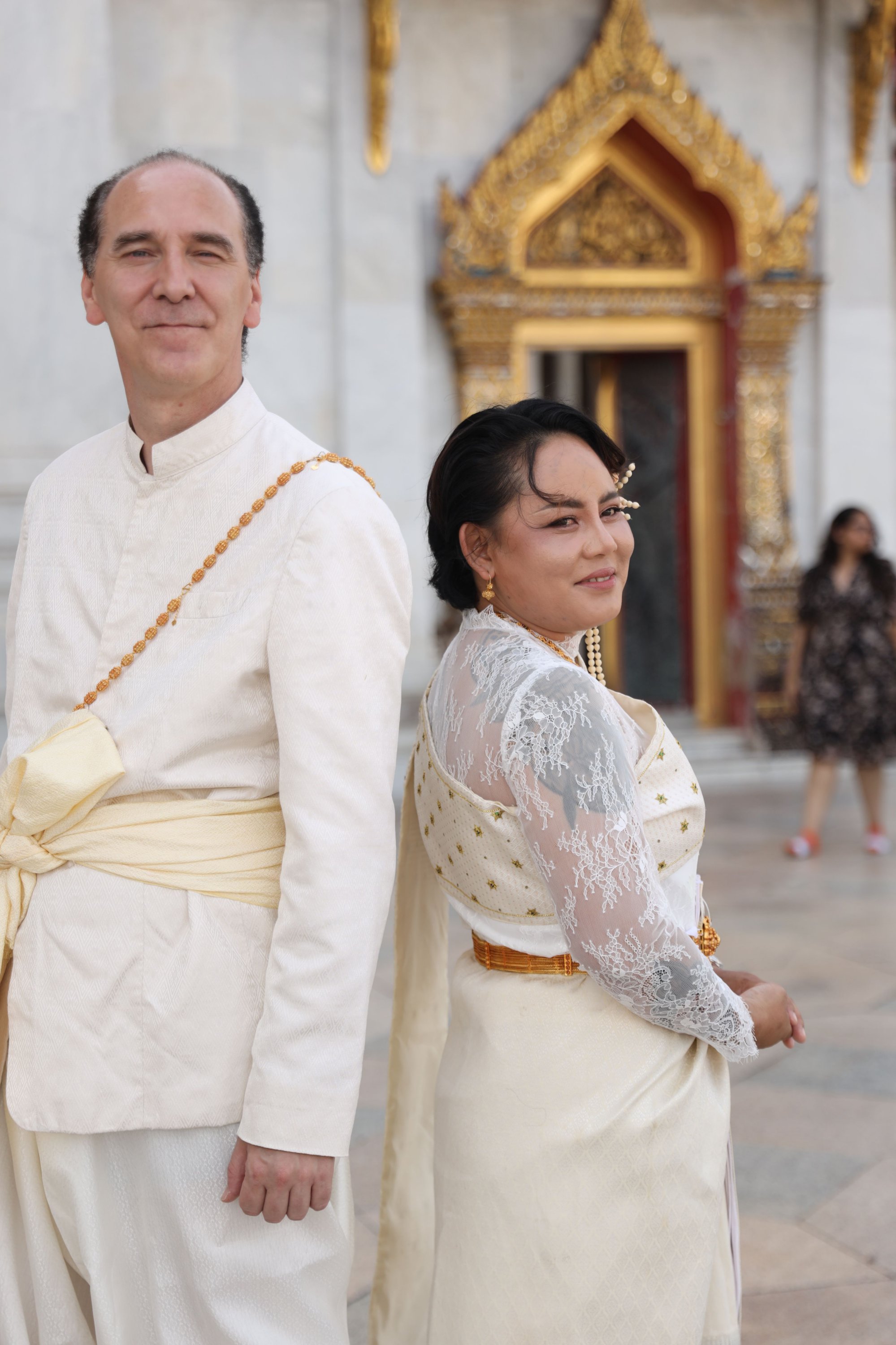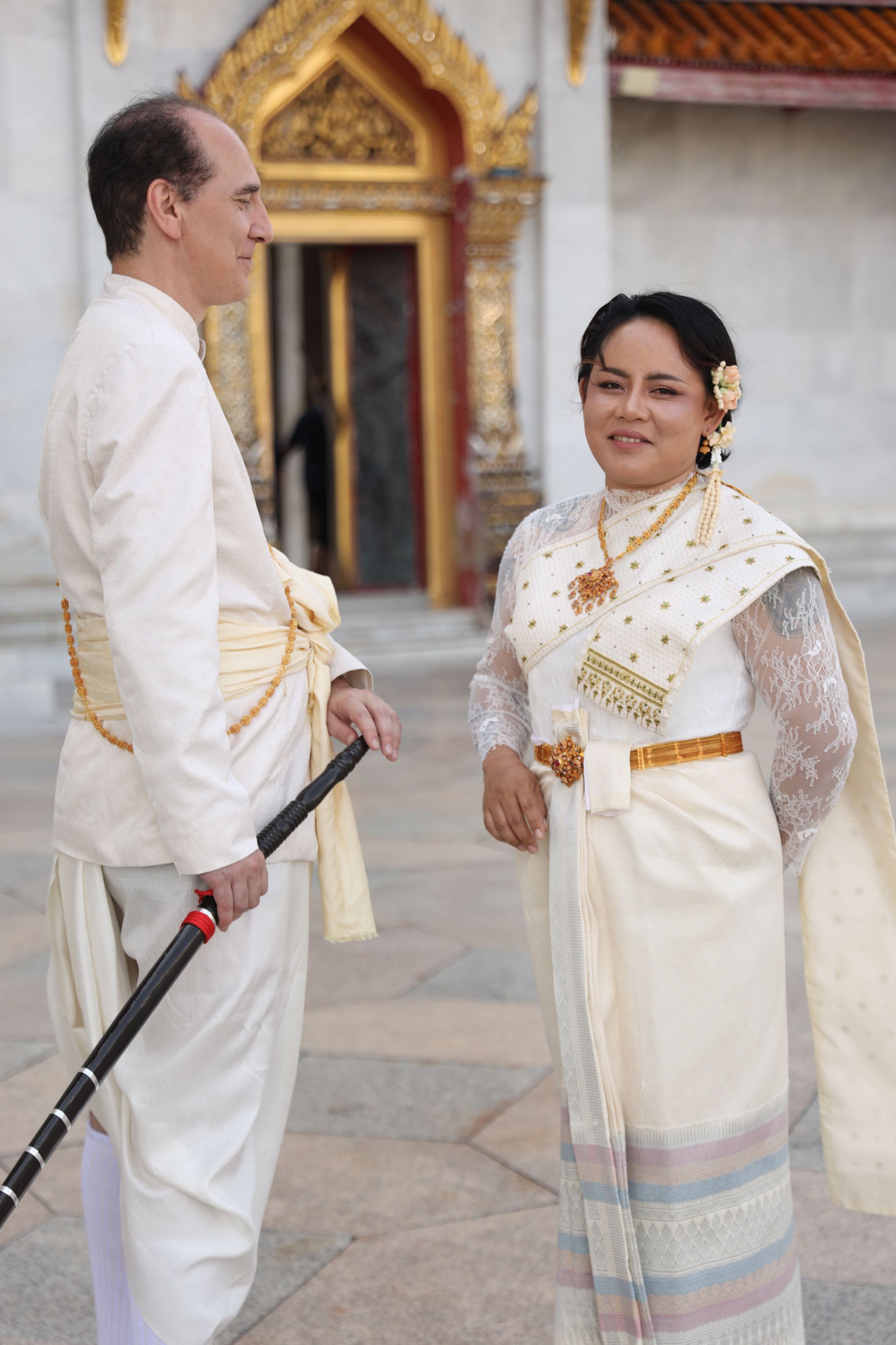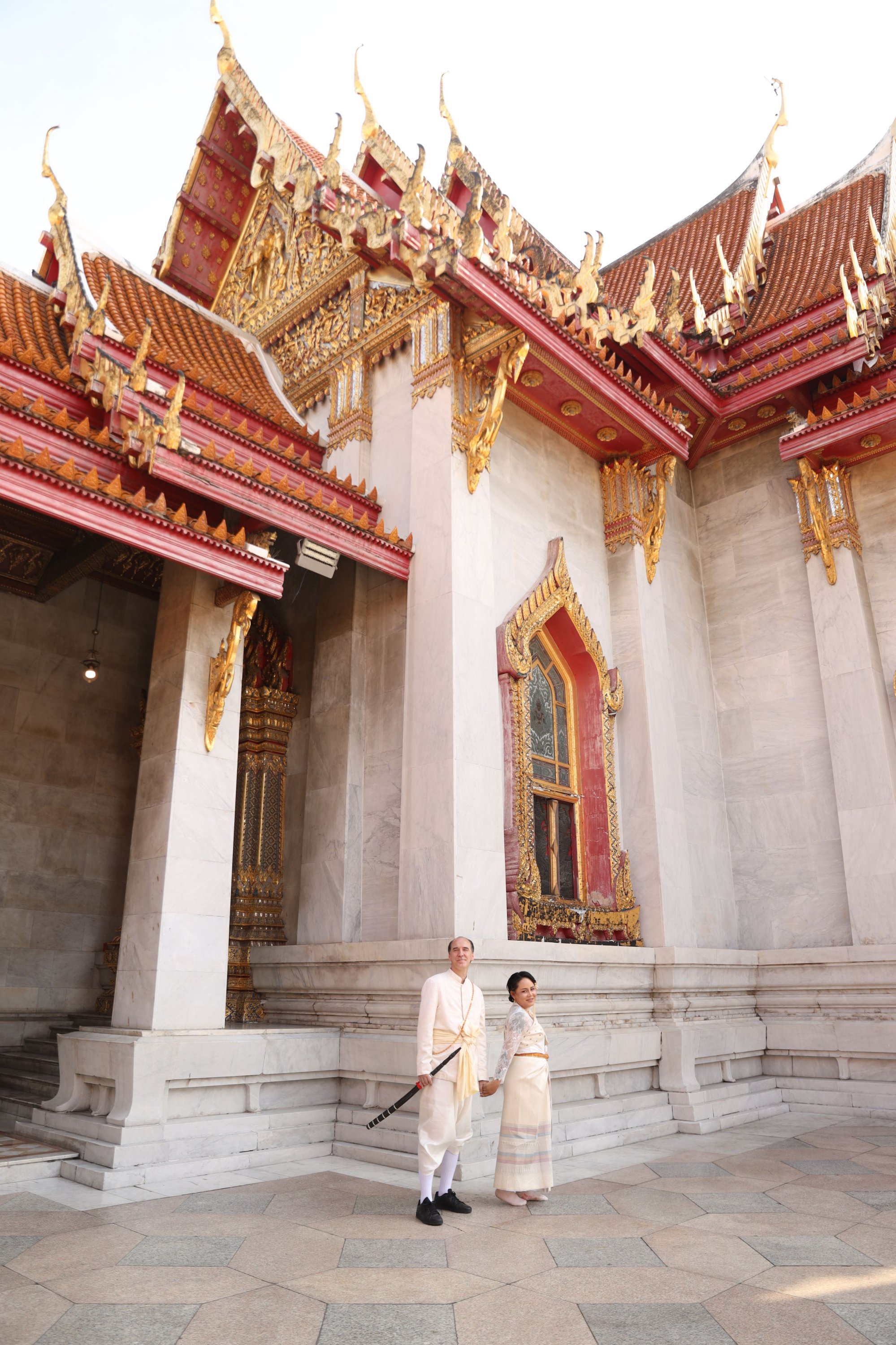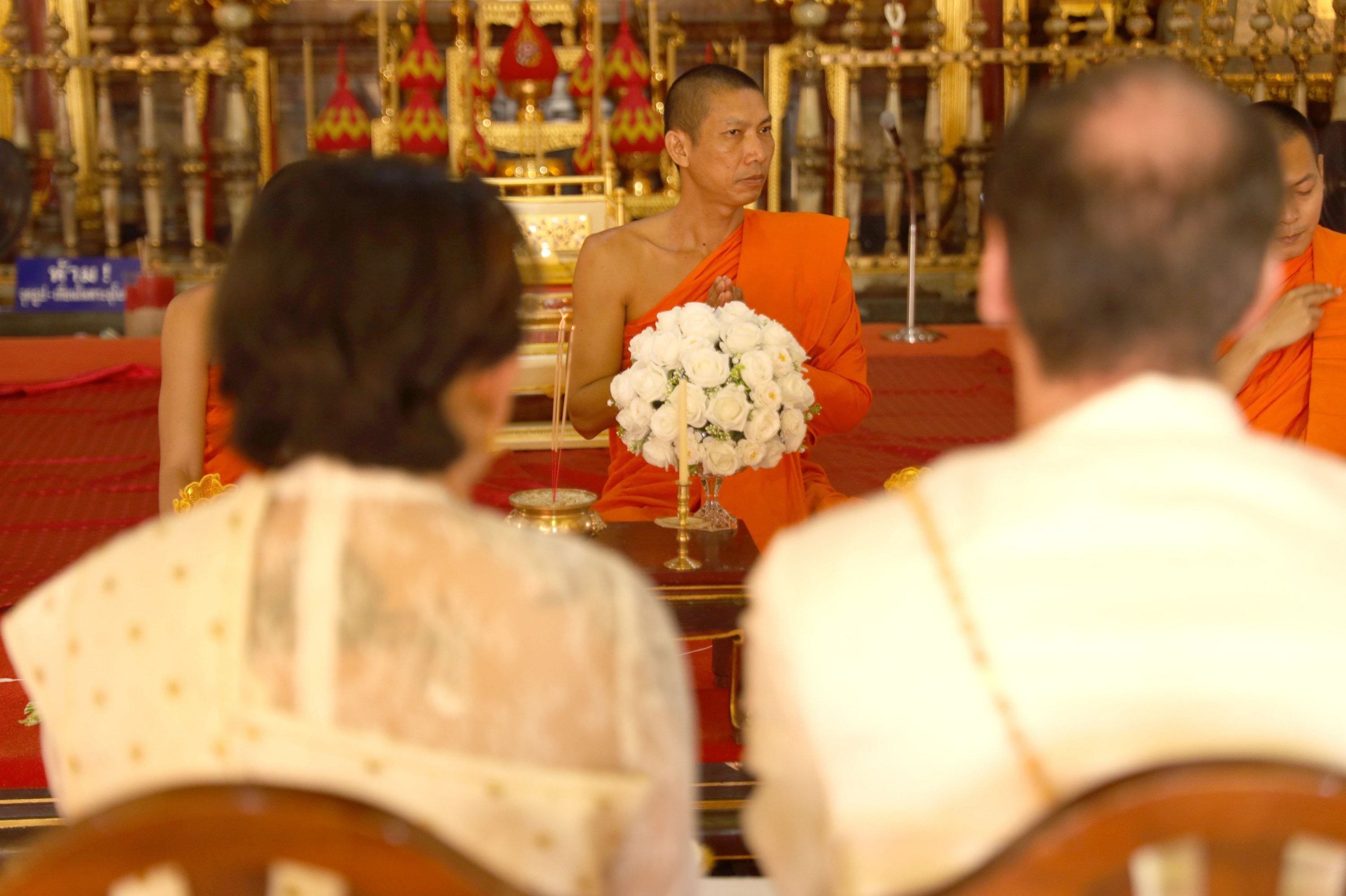 Premier mariage de la série (sur 5), ici, en Thaïlande, bouquet final du projet 5.0 W.A.P. Un moment plus que magique avec une véritable cérémonie traditionnelle au temple de marbre dans le plus pur style thaïlandais. Bénédiction à l’eau, allumage de bougie, et marquage du front sur fond de chants traditionnels marquèrent cette journée inoubliable.