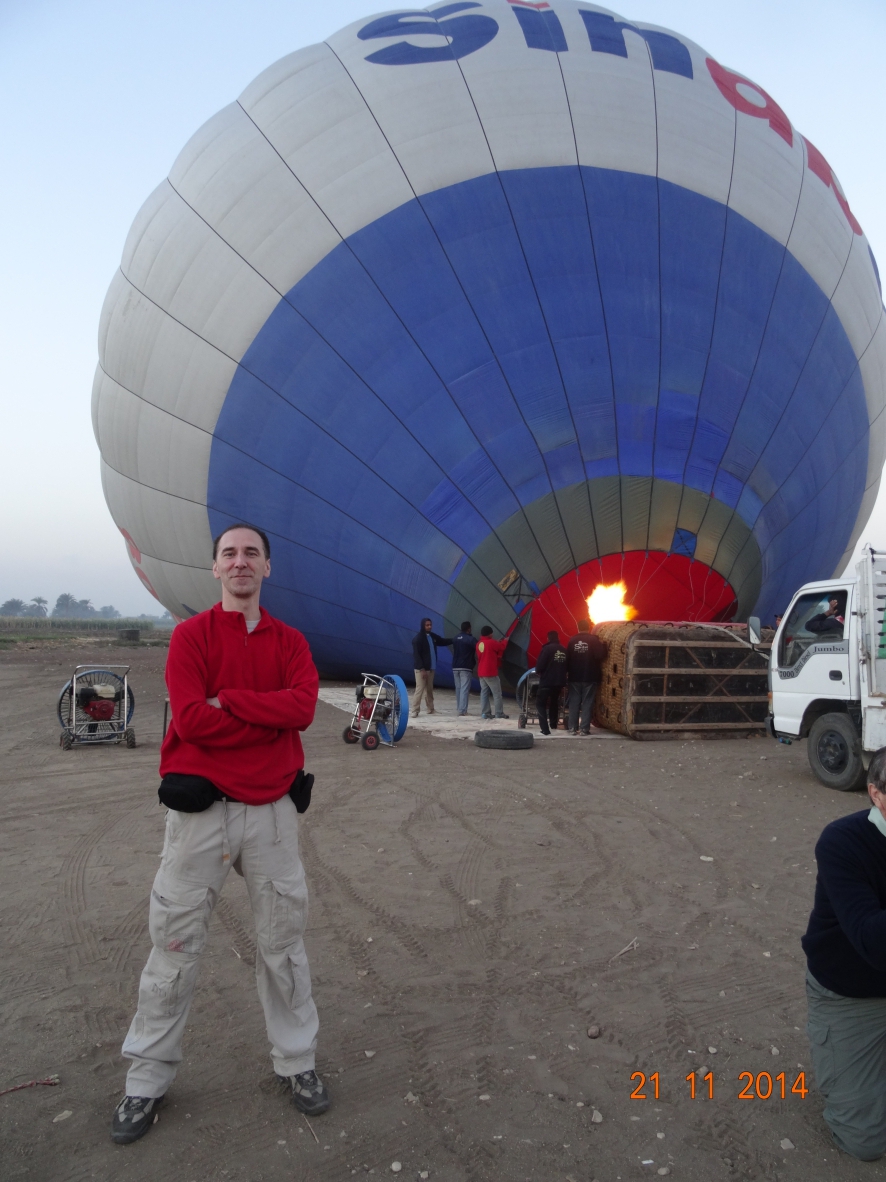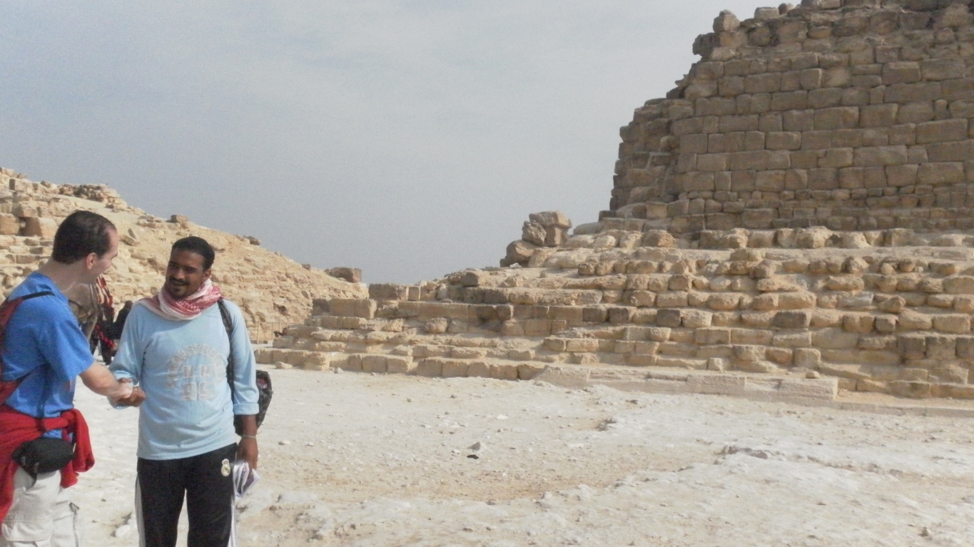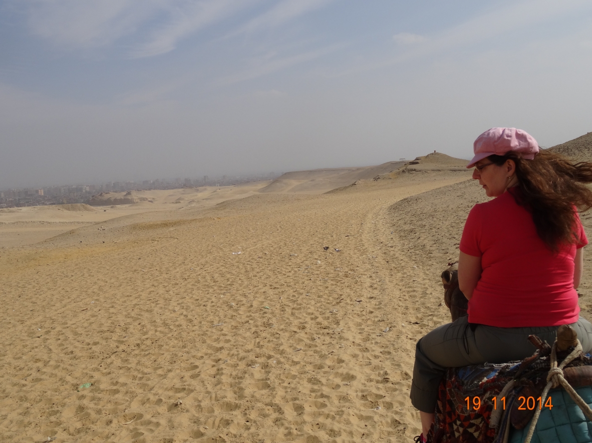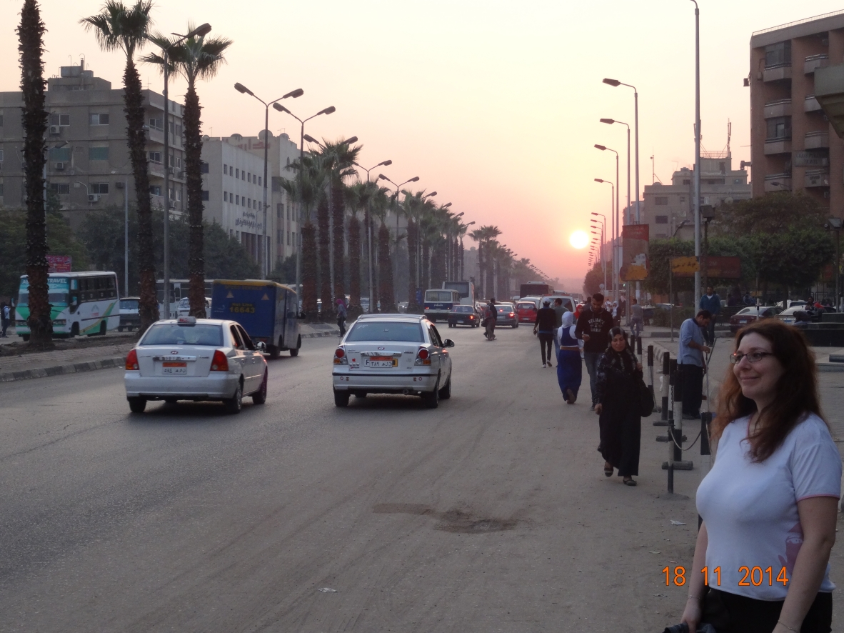 Le caire, lever du jour. Un flot de voitures impressionnant, une ville grouillante de monde, bruyante... et pourtant quand on s'y intérésse de plus près, des habitants simples, un petit marché aux fruits, un boulanger qui nous fait goûter ses biscuits très bons et faits à la main...sans oublier au loin, dans le brouillard, trois pyramides...
