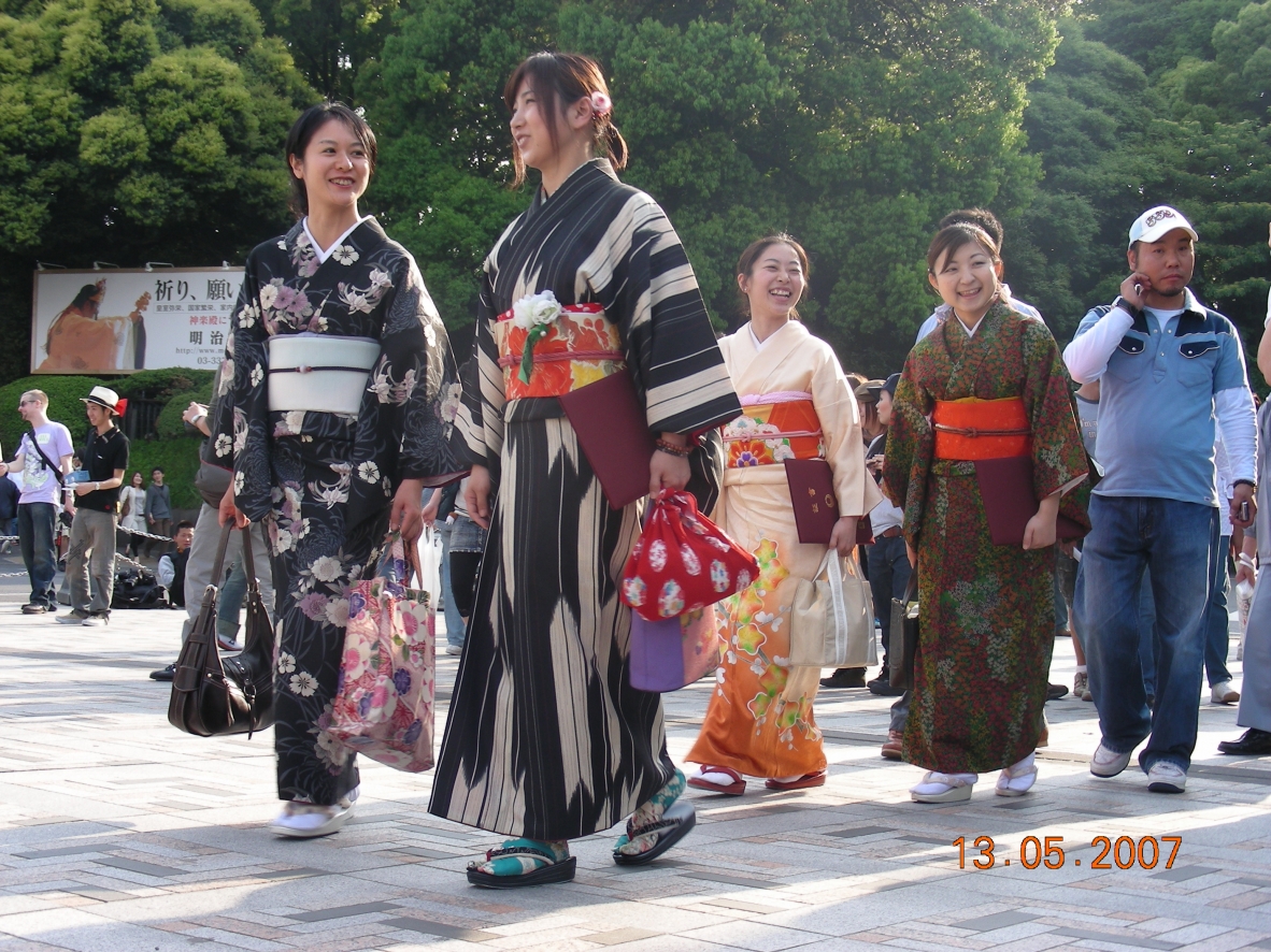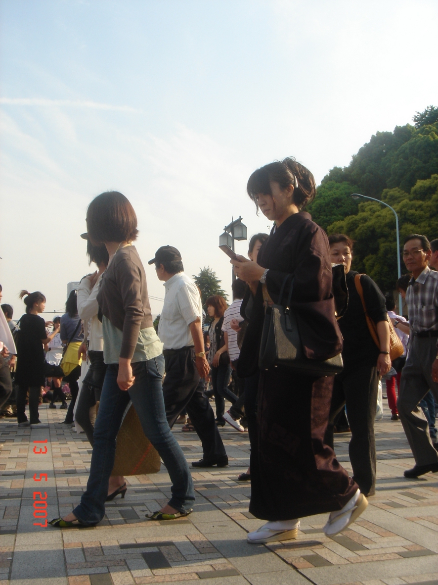 Harajuku, un jour de pluie. La takeshita Dori, l'une des rues principales, se voit traversée par des dizaines de parapluie abritant des japonais et japonaises qui ne pourront faire leur défilé de cosplay habituel non loin du Yoyogi Park sur le pont qui y mène. C'est donc vers le temple que nous décidâmes de nous abriter et assister, en cette malgré tout belle journée pluvieuse à un mariage dans le plus grand respect solennel, loin du mordernisme et du cosplay, paré des traditionnels kimonos aux couleurs toutes plus magnifiques les unes que les autres... Le soir, un concert fabuleux nous attendait, celui d'un groupe de visual kei et qui font hurler des centaines de japonaises toutes complètement hystériques autour de nous, un pur bonheur et une pure folie de voir cela de nos propres yeux....