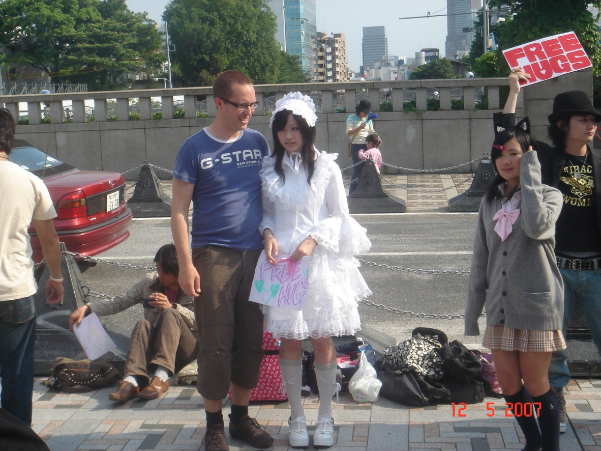 Harajuku, sans la pluie :-). A peine sortis de la station de métro, l'on est déja entouré de plusieurs dizaines de cosplayeurs et à peine plus loin des dizaines de musiques retentissent dans le Yoyogi Park, berceau de la naissance de plusieurs groupes connus comme le Tokyo Rockabilly Club, toujours présent sur des airs de Rock'n'Roll. Le cosplay et l'animation sont légion ici et c'est un grand moment que nous partageons grâces aux "free hugs" que nous offrent les japonaises...soupir...